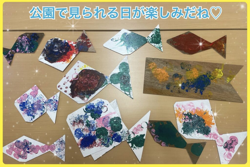 絵具を使って、ハートや花、丸のスタンプをしたり、