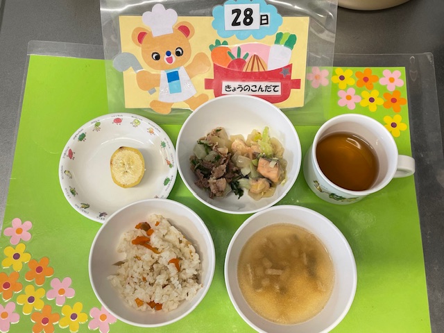 いただきますの挨拶の前に「🎼きっきっきのこ♪~」と歌いだす2歳児さんたち…