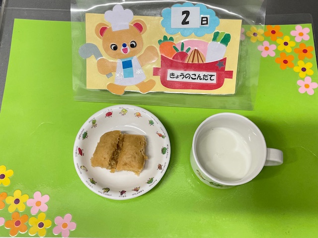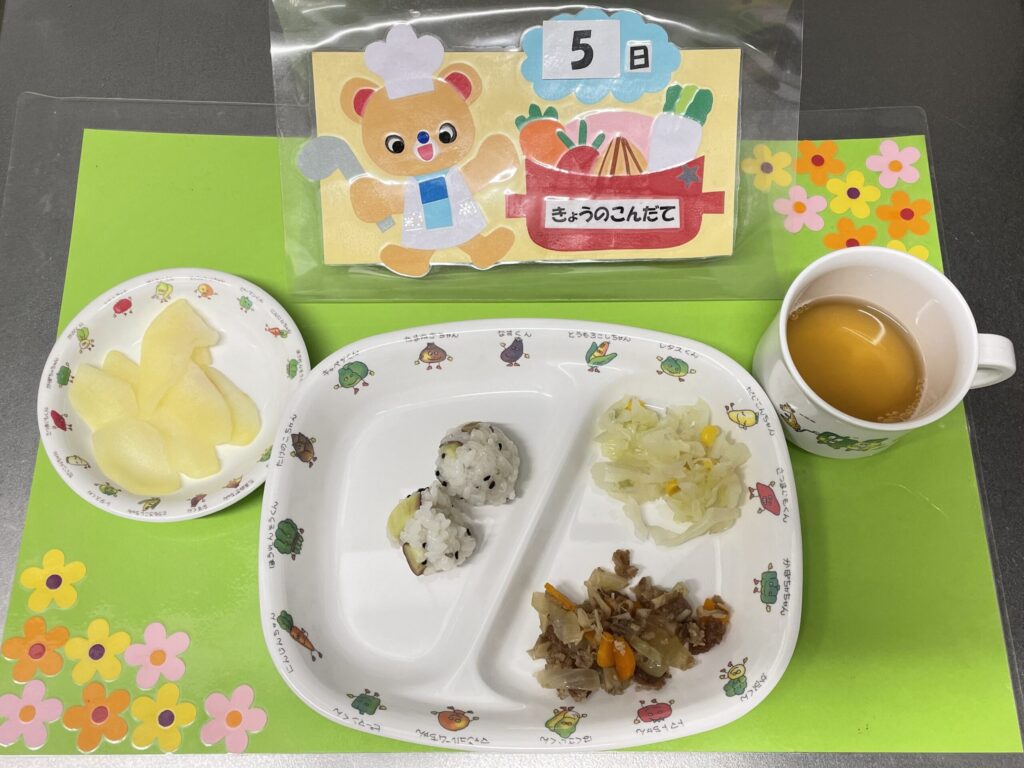 今回の給食の葉野菜は「キャ・ベ・ツ・だよ~!」と伝えると、「キャベツのなかから」という手遊びをやりだす2歳児さん。