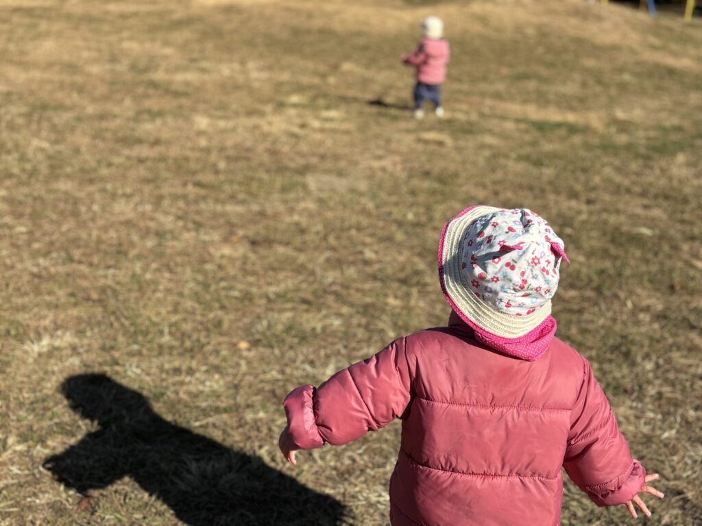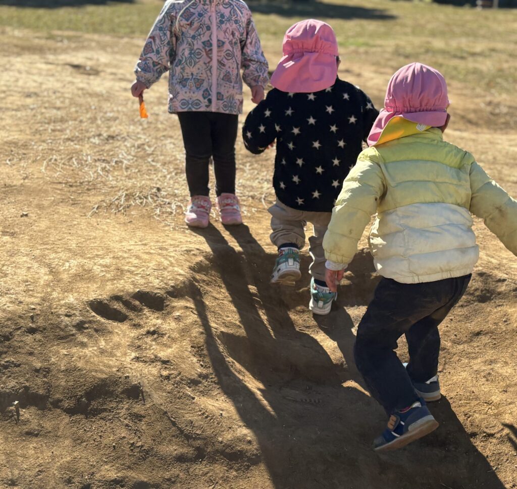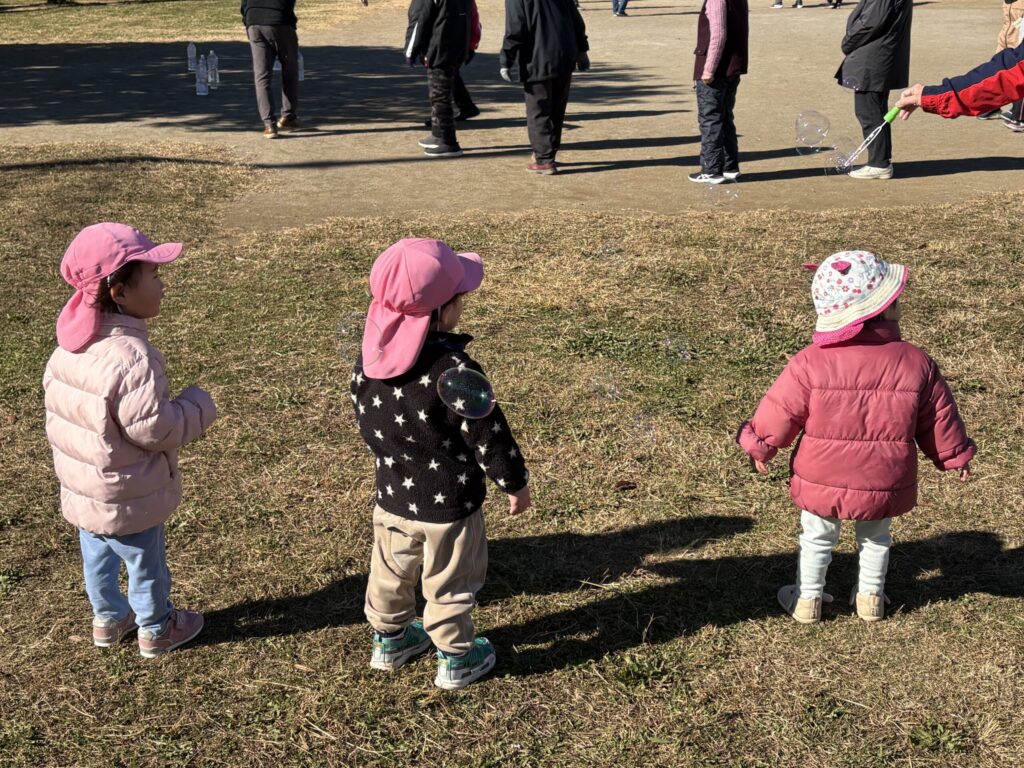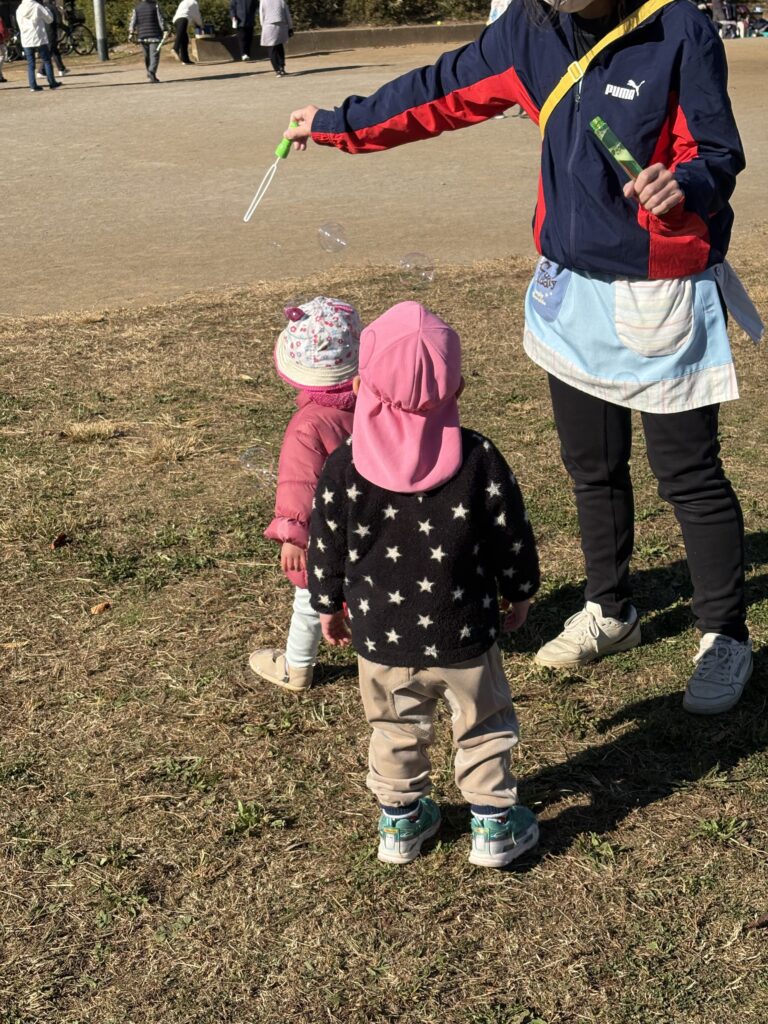 シャボン玉が飛んでいく所を楽しそうに追いかけていく子どもたち✨