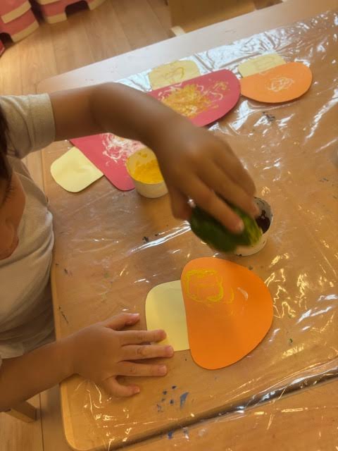 「ピーマンは優しく持ってね!」とお約束。 絵の具が手に付くことにも慣れてきた様子で