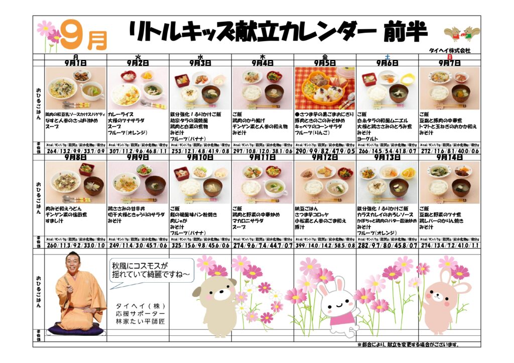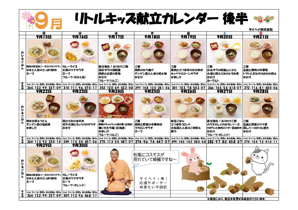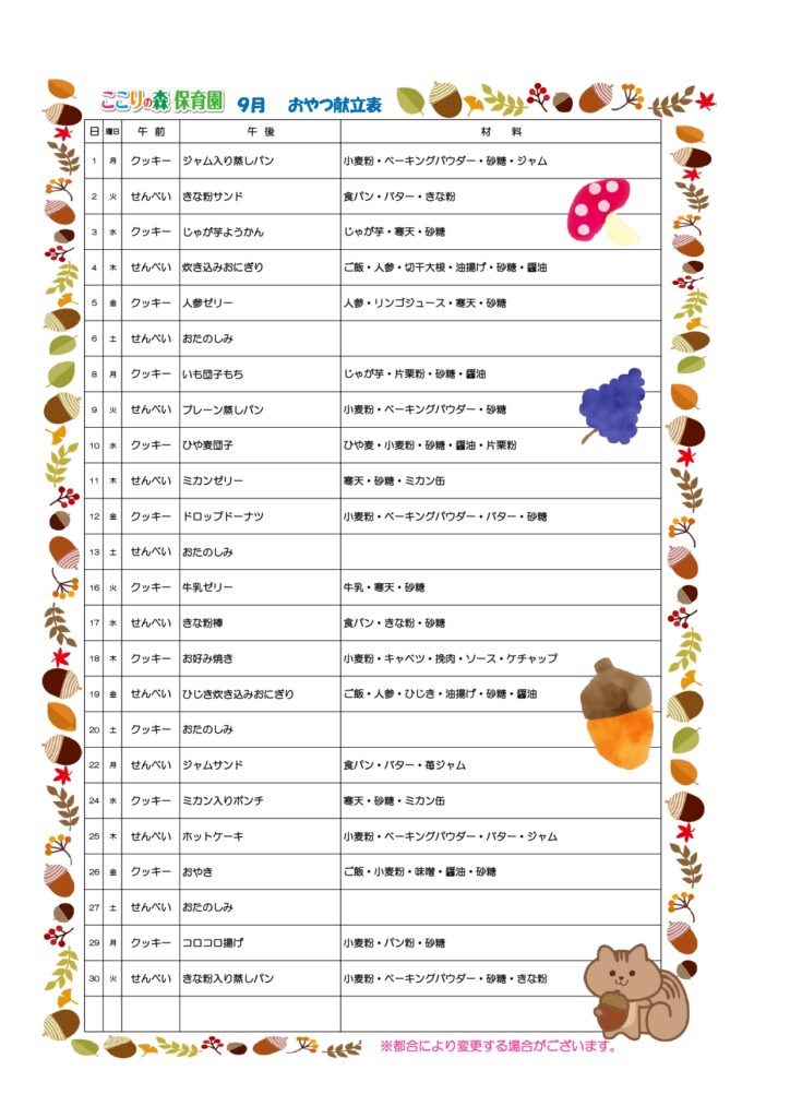 9月給食・おやつ献立など