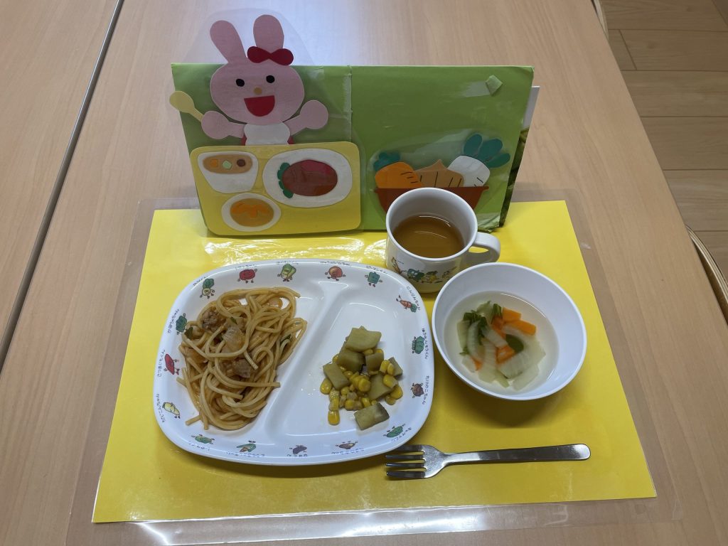 スパゲティナポリタン・さつま芋とコーンのコロコロ炒め、スープです。