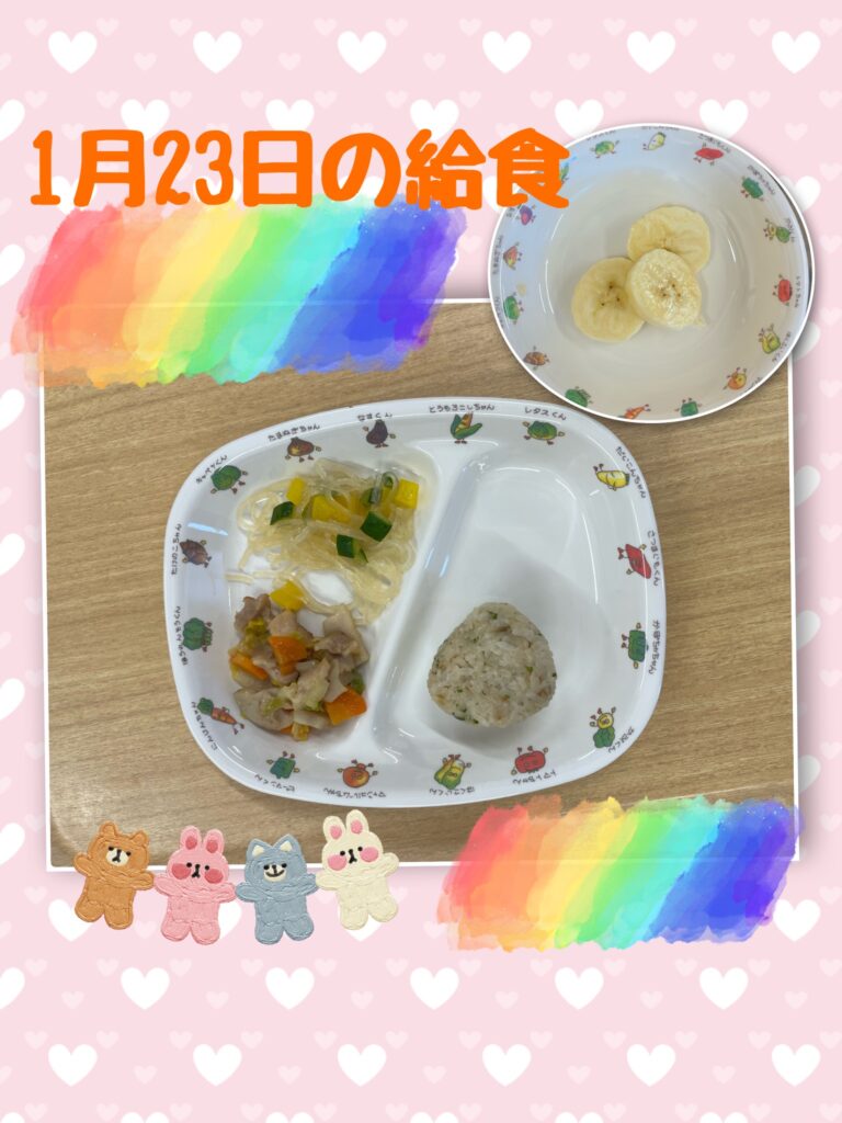 ツナのあおさおにぎり 鶏肉と冬野菜の生姜炒め 春雨サラダ バナナ