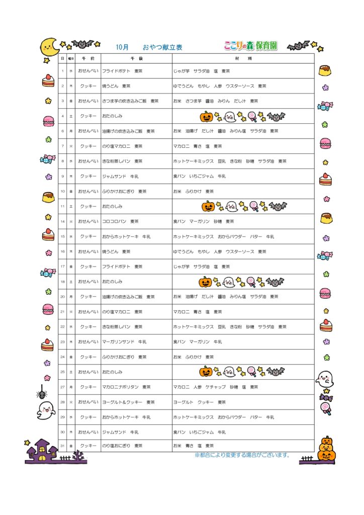🎃10月給食、午後おやつ献立表・食育便り🎃