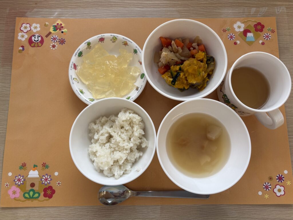 ご飯・白糸タラのコロコロ甘辛揚げ・大根と鶏肉の煮物・みそ汁・アップルゼリー