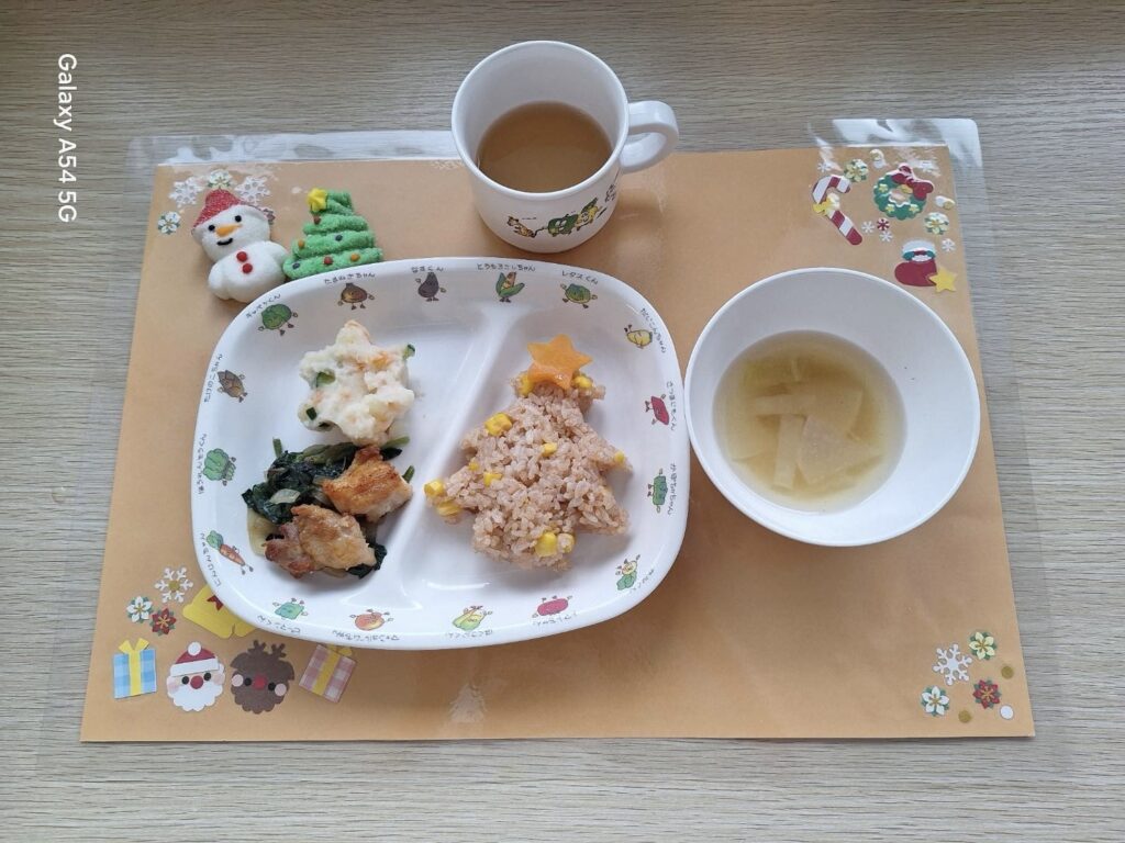 コーンケチャップライス・照り焼きローストチキン・ポテサラツリー・スープ・フルーツ(みかん)