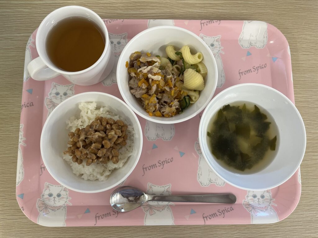 納豆ごはん・豚肉のオニオンソース・マカロニツナサラダ・みそ汁