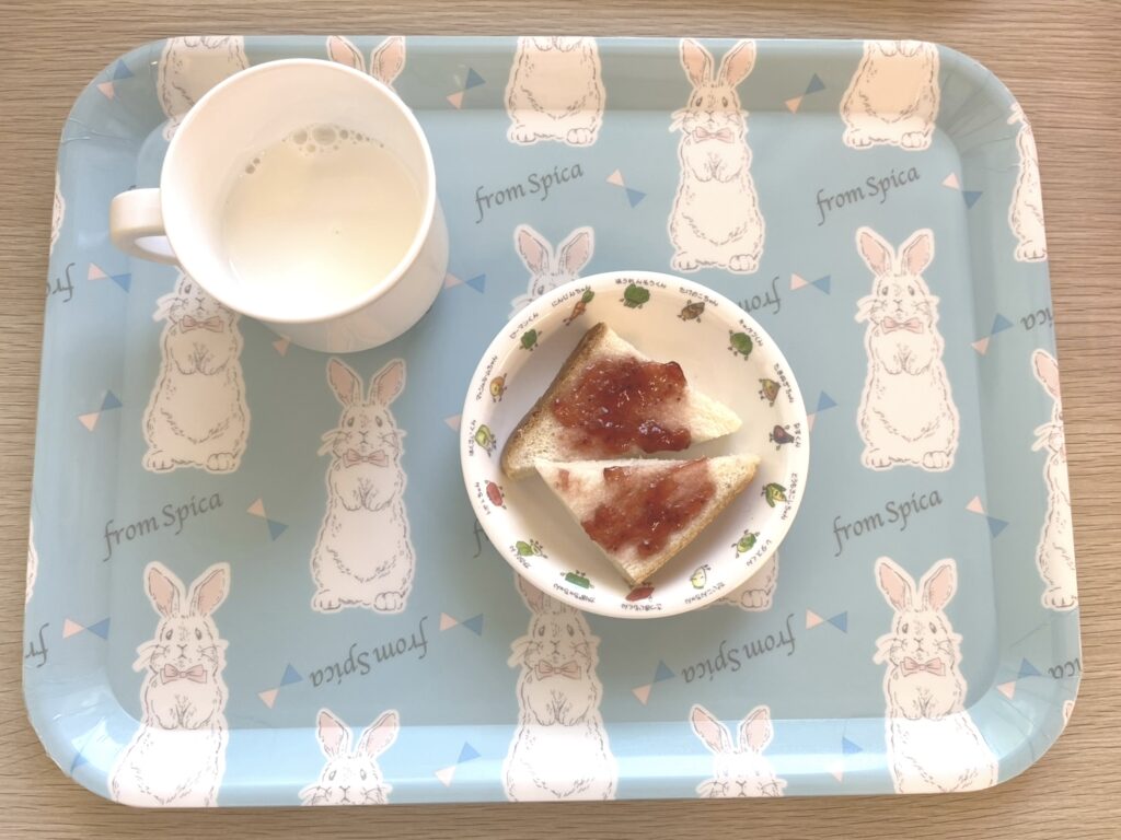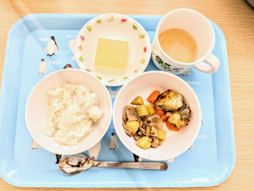 ご飯・白糸タラの磯風味焼き・さつま芋と豚肉の煮物・みそ汁・アップルゼリー