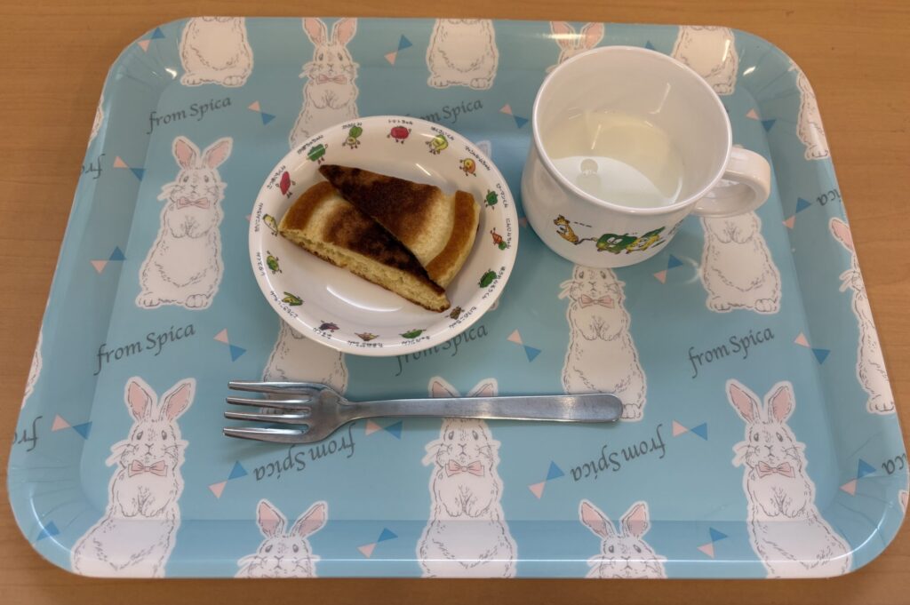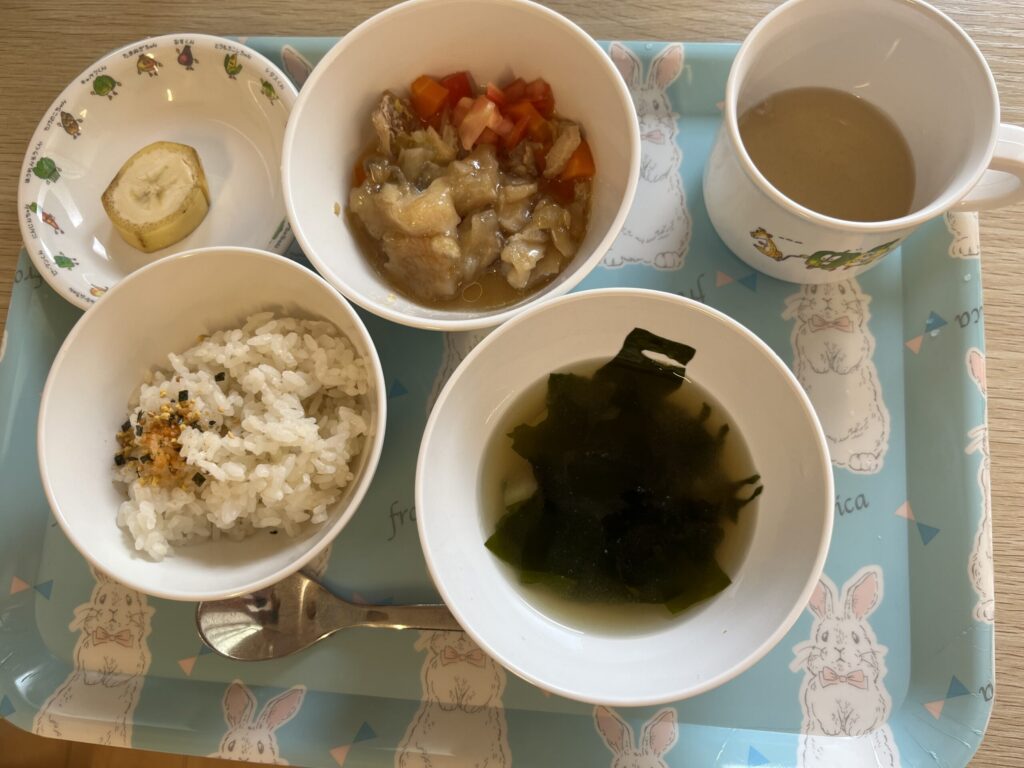 ふりかけご飯、助宗ダラの蒲焼風、鶏肉と白菜の煮物、みそ汁、フルーツ(バナナ)