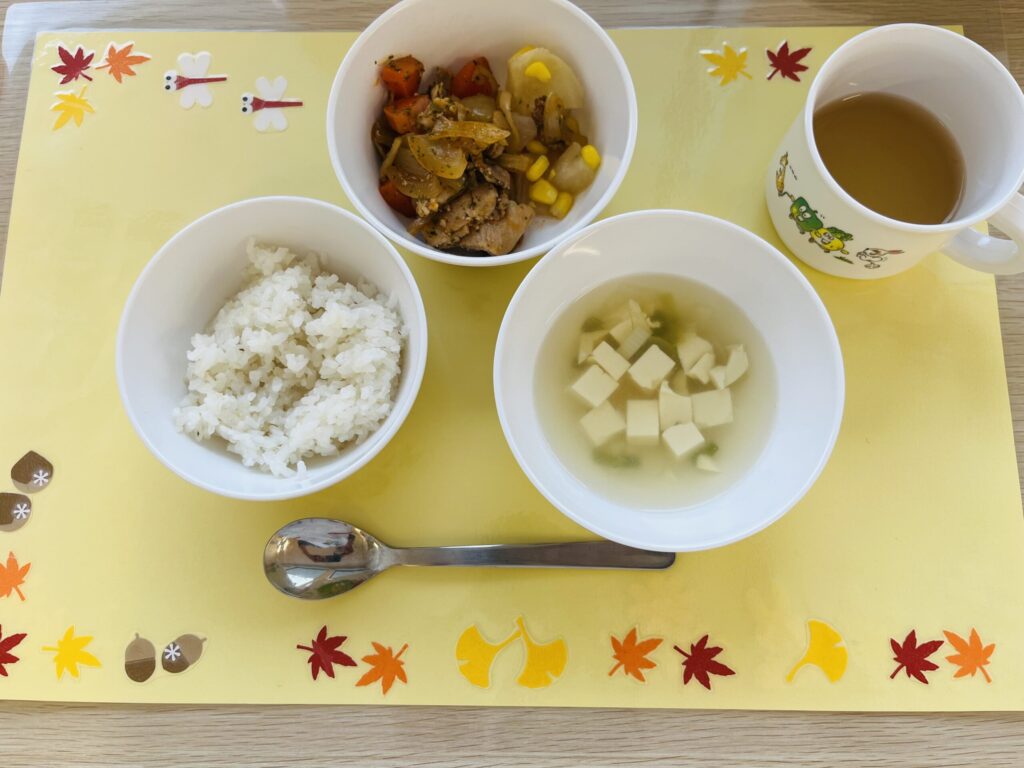 ご飯・豚肉のケチャップからめ・かぶとコーンのサラダ・スープ