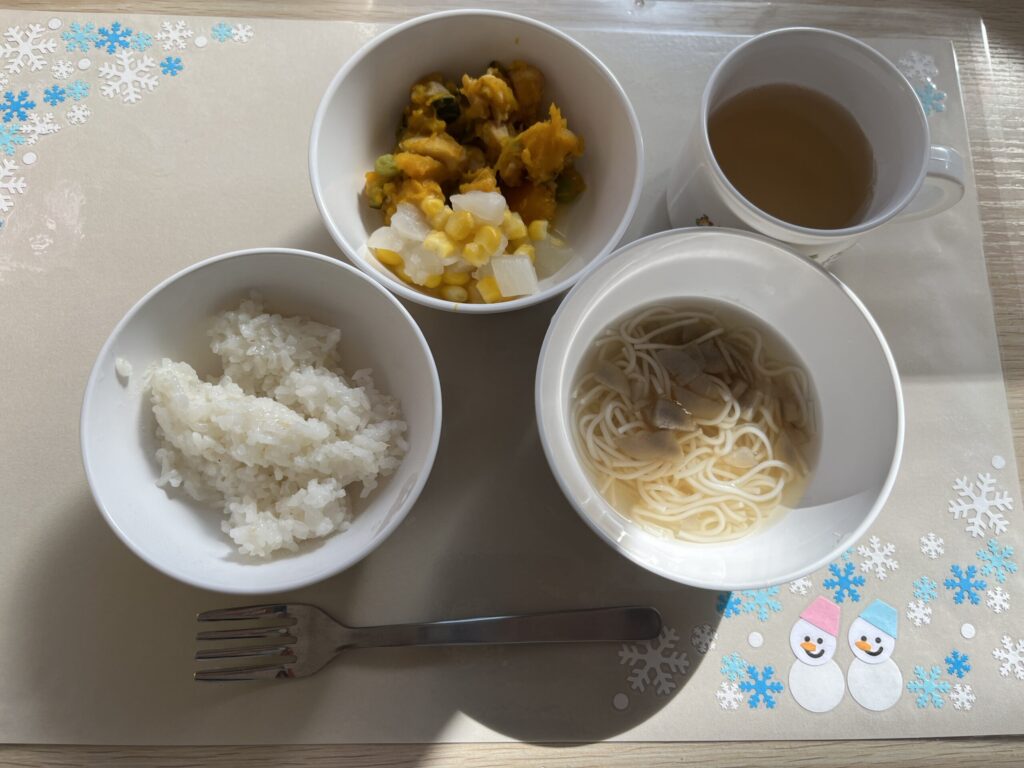 ご飯・鶏肉と野菜のうま煮・かぶのコーンサラダ・みそにゅうめん