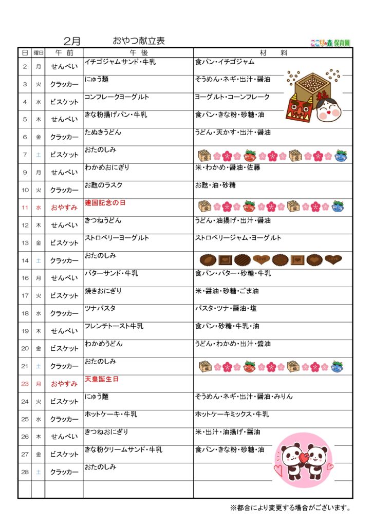 🍩2月の給食・おやつメニュー・食育だより🍩