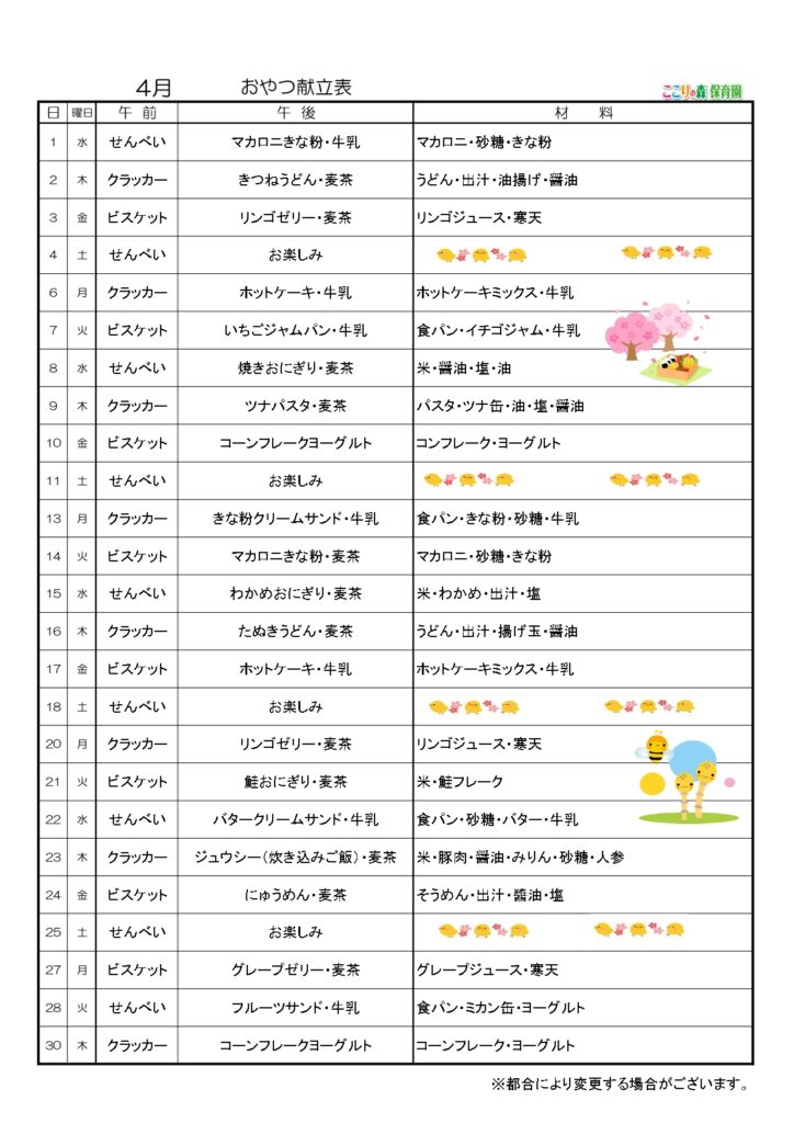 R8🌸4月 給食・おやつ献立表・食育だより🌸
