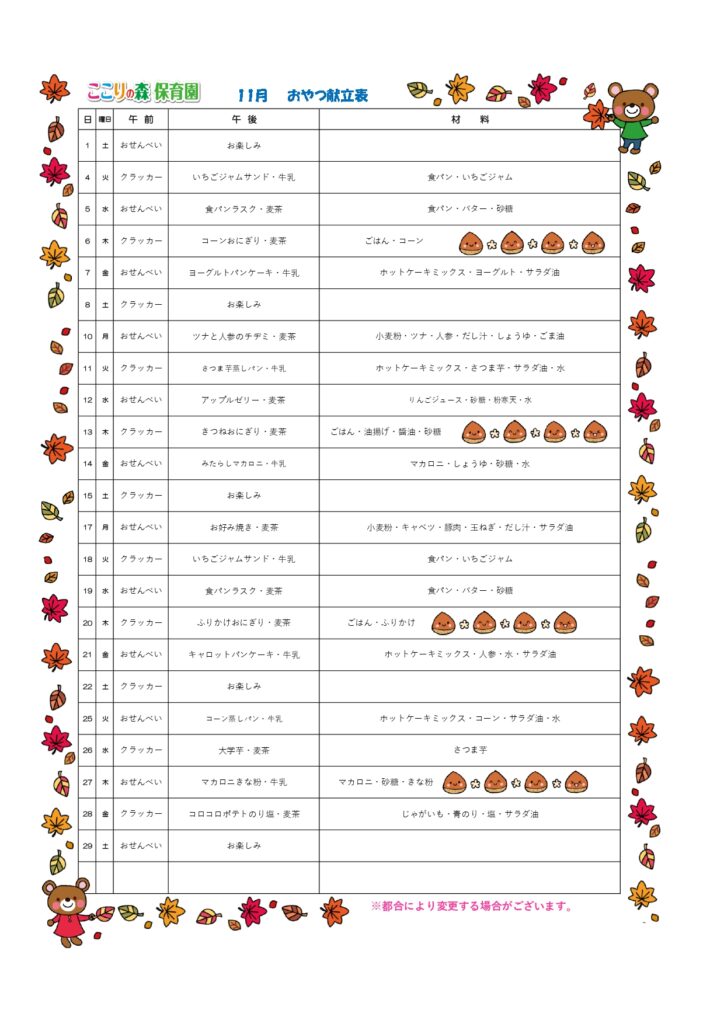 🌰🍄🟫11月の給食献立🍁🍠