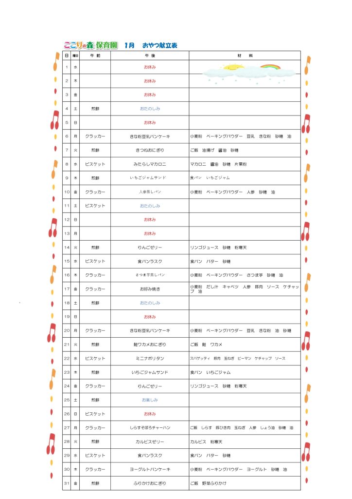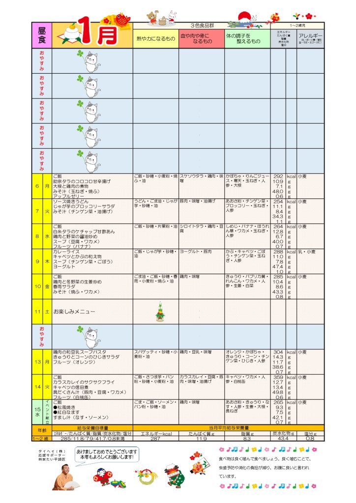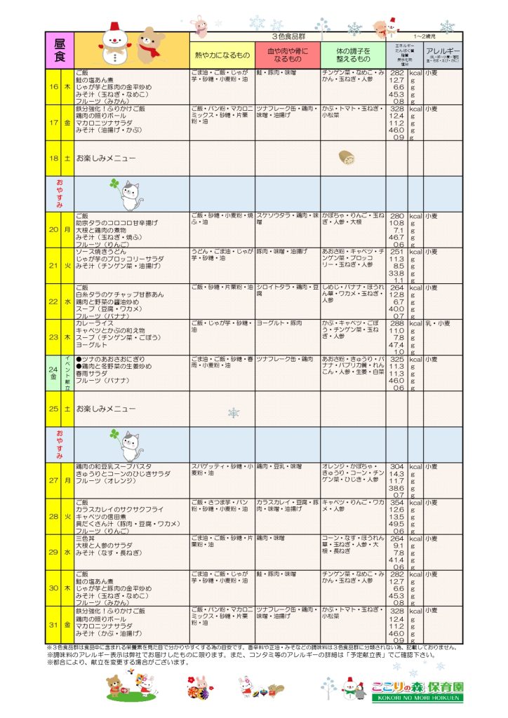 1月給食献立表・おやつ献立表・食育だより